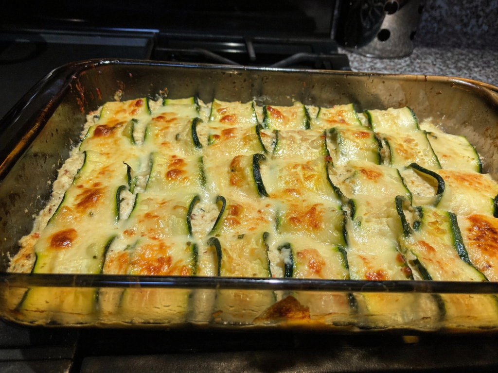 - 4 large zucchini, sliced thin lengthwise (use mandoline)