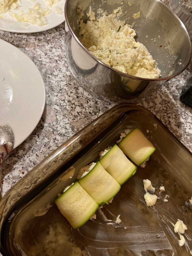 - Add 1–2 teaspoons of filling to the end of each zucchini ribbon.